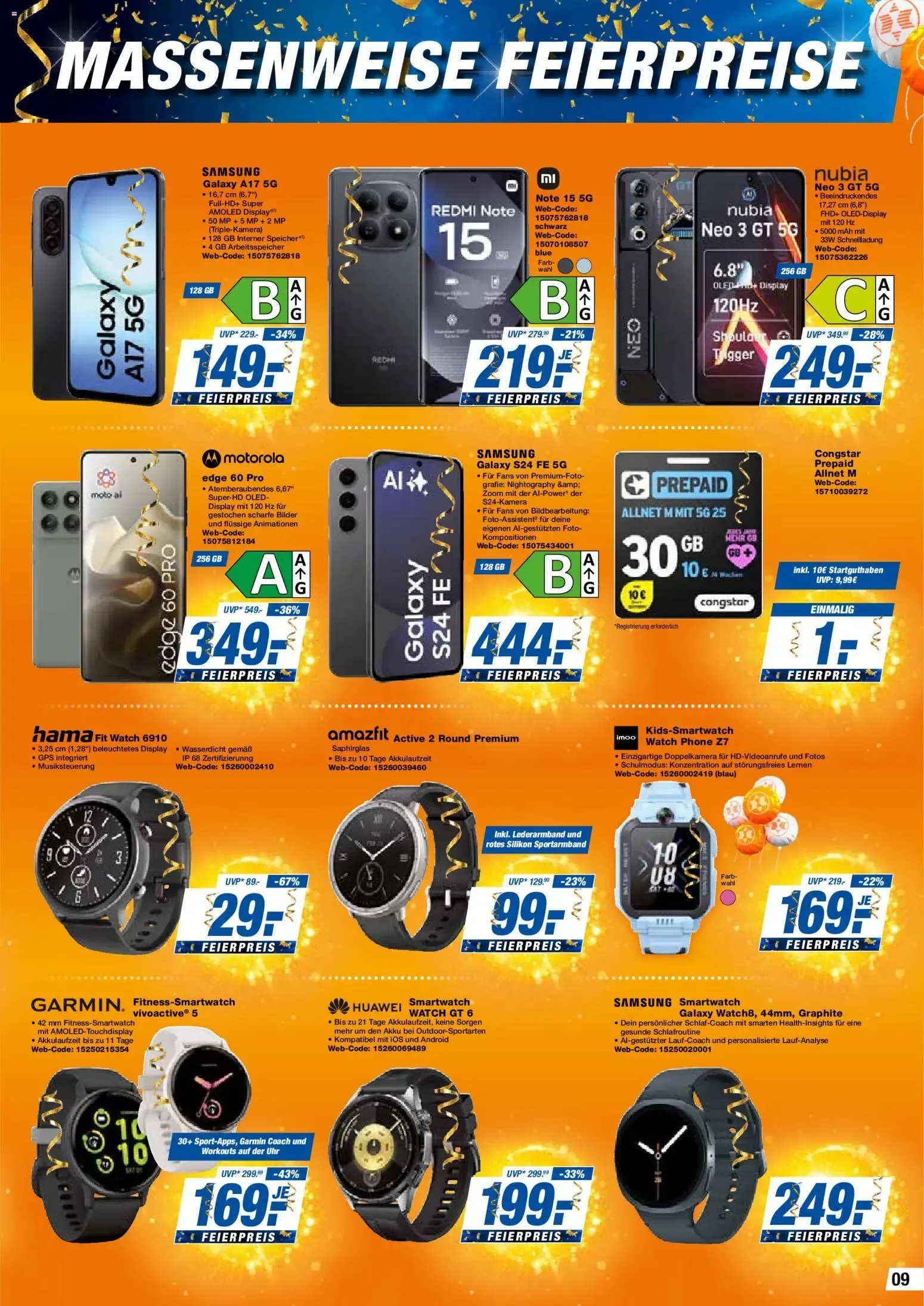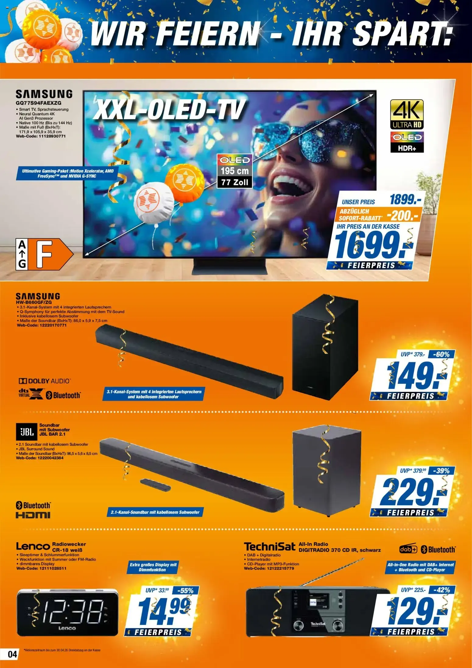 Auf dem Bild sieht man eine große Auswahl an Technikprodukten mit „Massenweise Feierpreise“-Aktion. 🎉 Im Mittelpunkt stehen leistungsstarke JBL-Lautsprecher, darunter ein tragbares Party-Modell mit LED-Lichteffekten sowie ein kompakter Bluetooth-Speaker für unterwegs. 🔊✨ Ergänzt wird das Angebot durch True Wireless Kopfhörer und Over-Ear-Modelle mit Noise Cancelling für intensiven Soundgenuss. 🎧