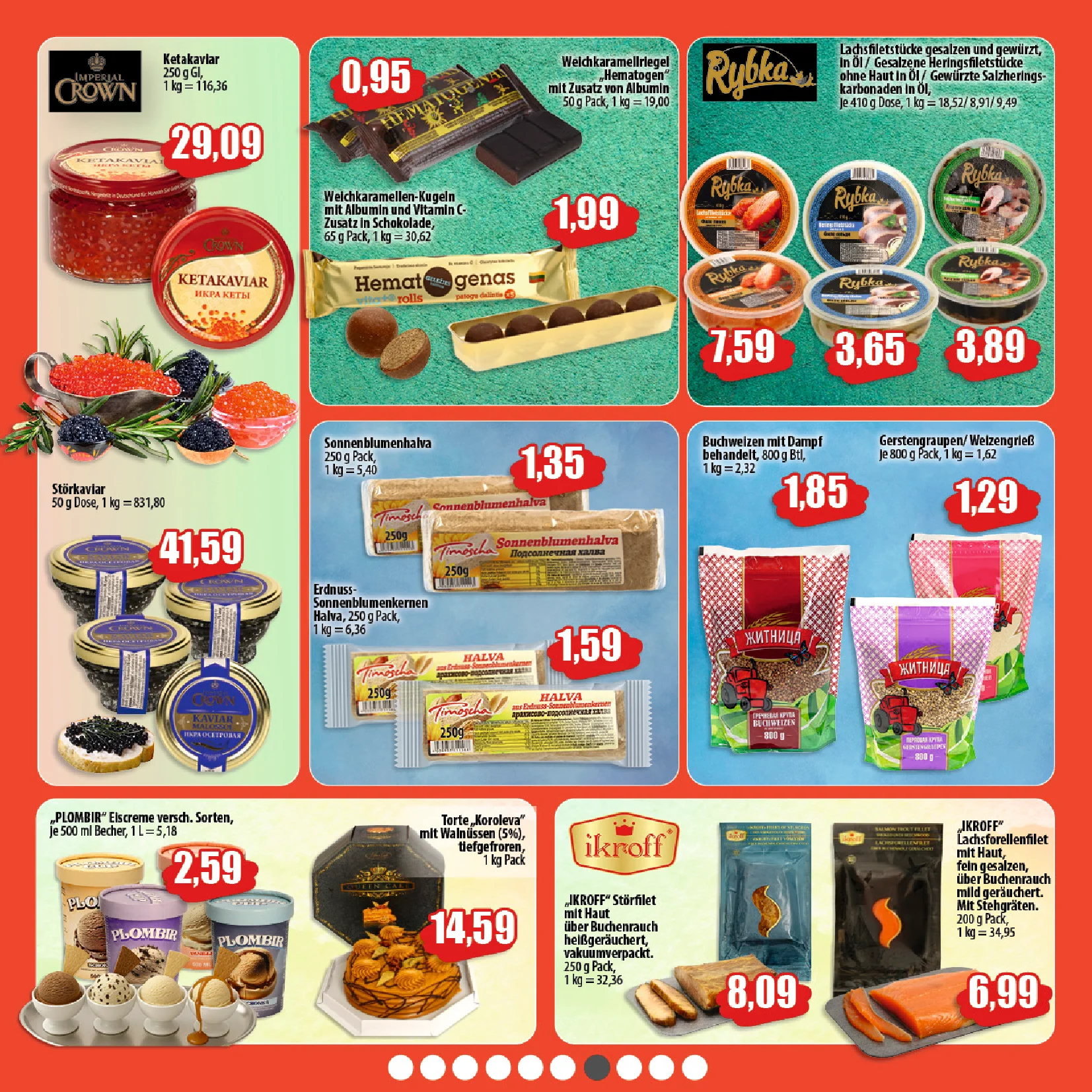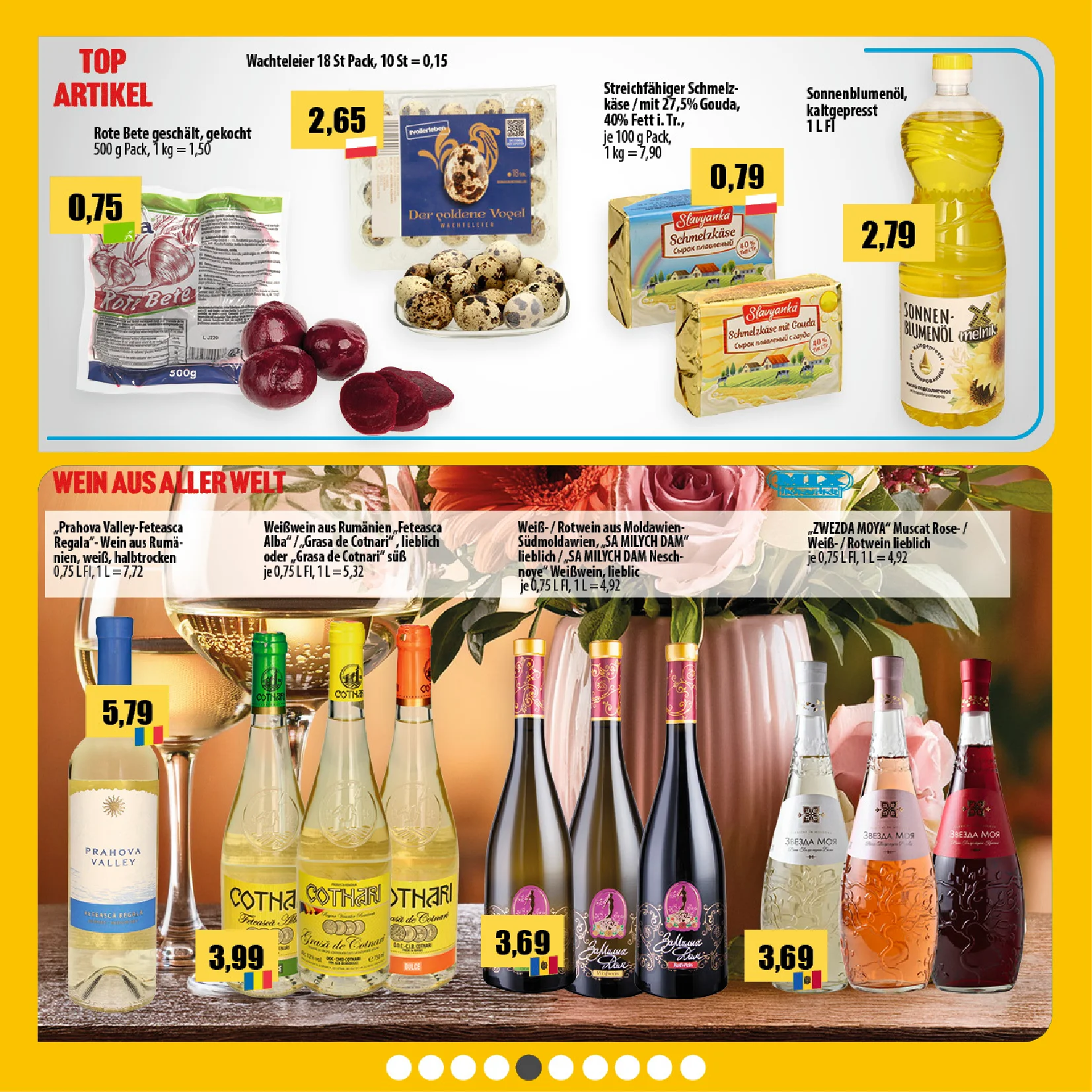 Auf dem Titelbild der Zeitung sieht man eine große Auswahl an Lebensmitteln 🥕🍞 sowie eine auffällige Präsentation von Fleisch- und Wurstspezialitäten. Im unteren Bereich werden Salami Mistrеt und Parizer Fleischwurst appetitlich auf Holzbrettern angerichtet, begleitet von frischen Tomaten 🍅 und Weintrauben 🍇. Die Preise sind deutlich hervorgehoben, was die attraktiven Fleisch Angebote sofort ins Auge fallen lässt 💶.